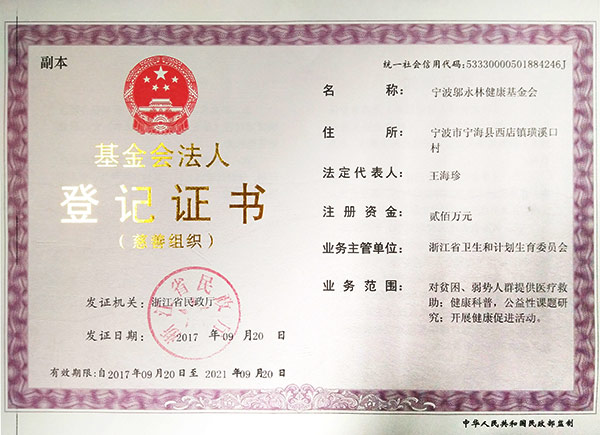 寧波鄔永林健康基金會,成立于2010年10月,是在浙江省民政廳注冊、由浙江省衛(wèi)生健康委主管的非公募基金會。基金會的原始基金數(shù)額為人民幣貳佰萬元,來源于雙林股份有限公司。《慈善法》頒布后,本基金會被認(rèn)定為慈善組織。